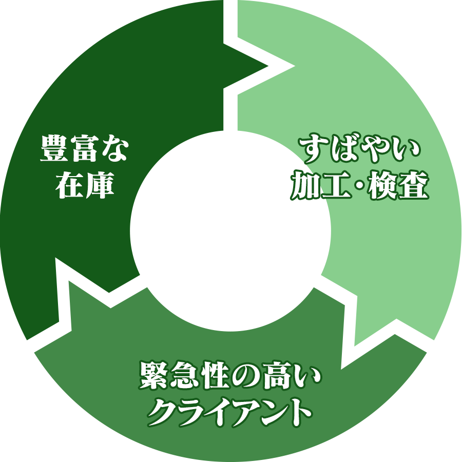 当社は多種多様な素材の在庫を常時取り揃えております。ご要望いただいた商品を、ご指定の納期で加工しお届けします。